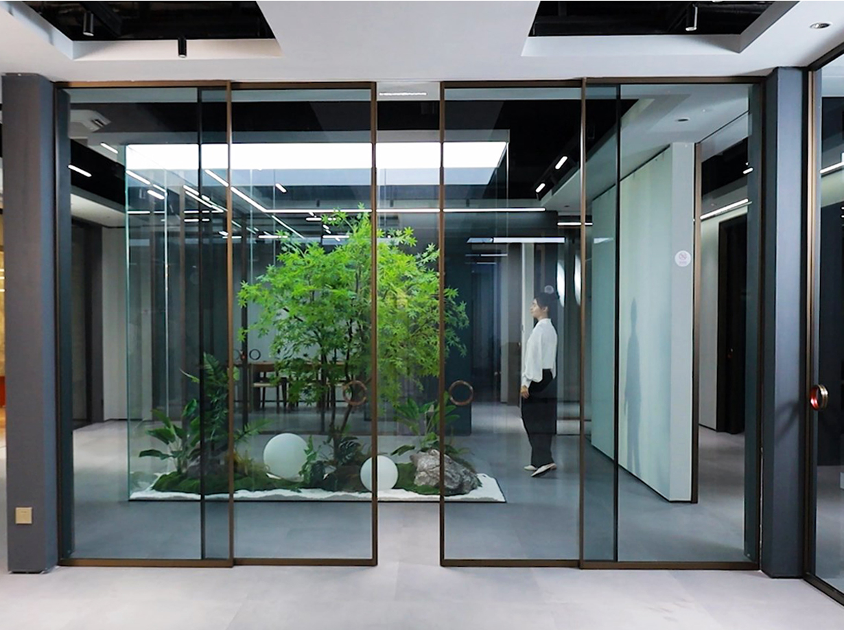 • Pereții despărțitori din sticlă permit trecerea luminii naturale, făcând încăperile mai luminoase și mai confortabile.